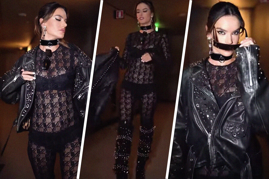 41-летняя модель Алессандра Амбросио пришла на показ Dolce&Gabbana в «голом» комбинезоне, грубых ботфортах с цепями, косухе и чокере. Звезде сделали укладку с голливудскими локонами и броский вечерний макияж.