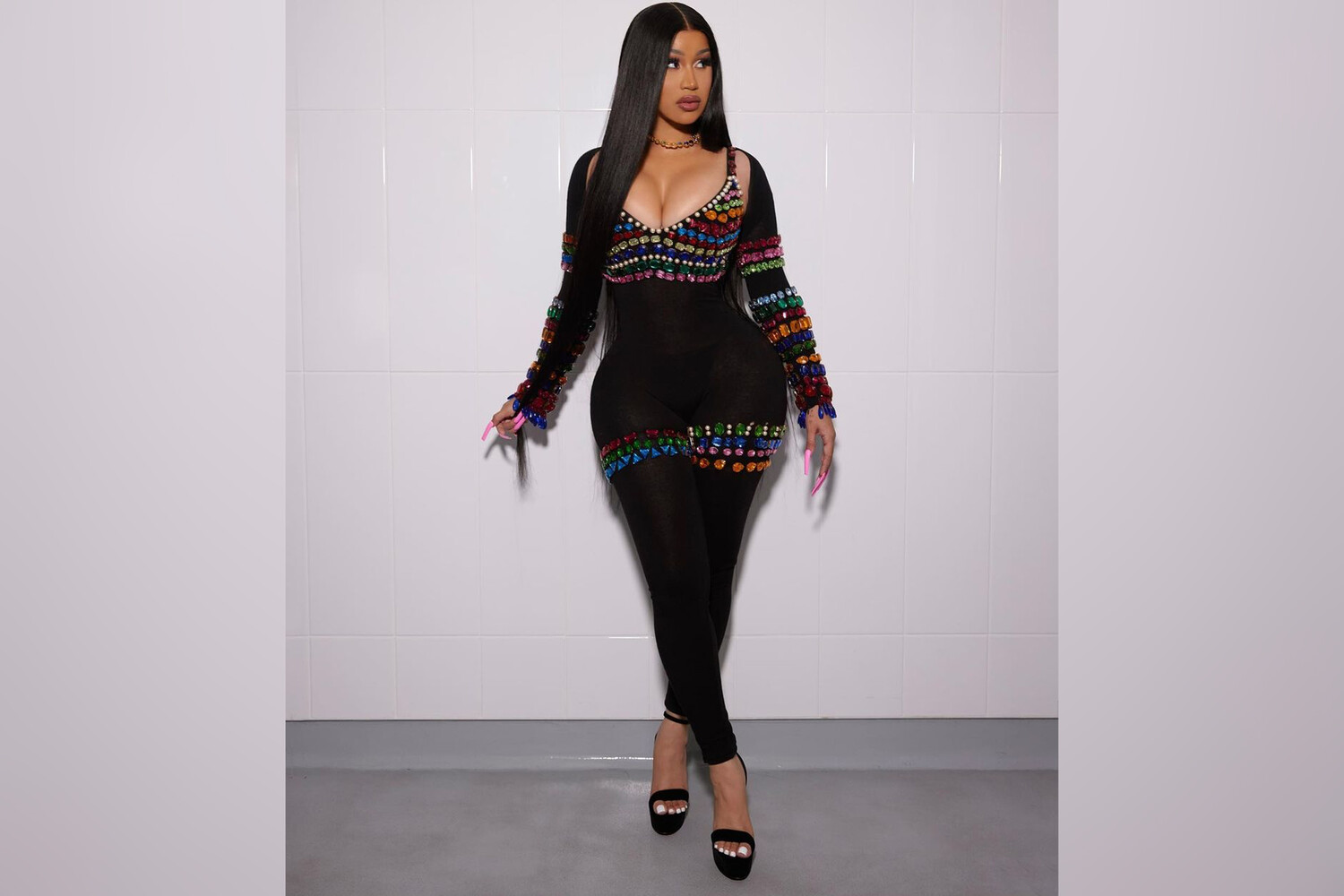 Карди Би опубликовала серию снимков, на которых продемонстрировала фигуру в обтягивающем комбинезоне с глубоким декольте. Костюм инкрустирован крупными камнями. К образу певица добавила ожерелье, серьги и завершила все открытыми босоножками на высоком каблуке.