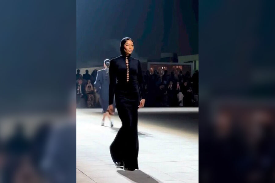 Наоми Кэмпбелл лично приняла участие в показе. 52-летняя супермодель вышла на подиум дважды. Сначала она появилась в обтягивающем платье в пол с капюшоном и глубоким вырезом в области декольте, которое надела без нижнего белья, а затем продефилировала в наряде с перьями.