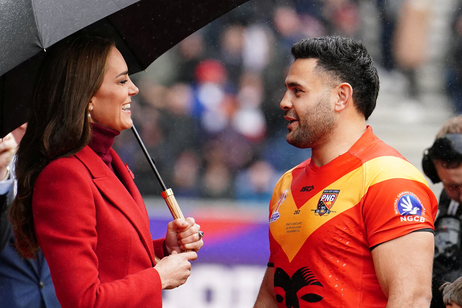 В субботу, 5 ноября, на стадионе DW в Уигане (графство Большой Манчестер, Великобритания) состоялся матч по регби между командами Англии и Папуа — Новой Гвинеи в четвертьфинале Кубка мира. Поддержать англичан пришла Кейт Миддлтон: она пожелала спортсменам удачи и неотрывно следила за игрой с трибун.