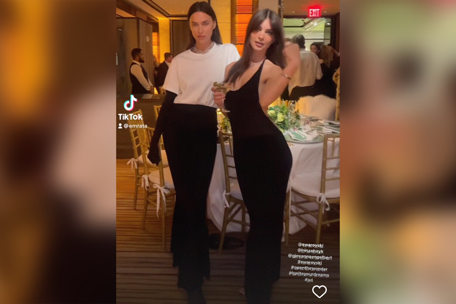 Эмили Ратаковски опубликовала видео, в котором она позирует вместе с российской моделью Ириной Шейк. Перед камерой американская модель позирует в черном прозрачном платье без белья и с открытой спиной. Ирина Шейк предпочла белоснежную футболку и облегающую юбку-макси, которые дополнила черными длинными перчатками. Она также добавила массивное колье с драгоценными камнями.