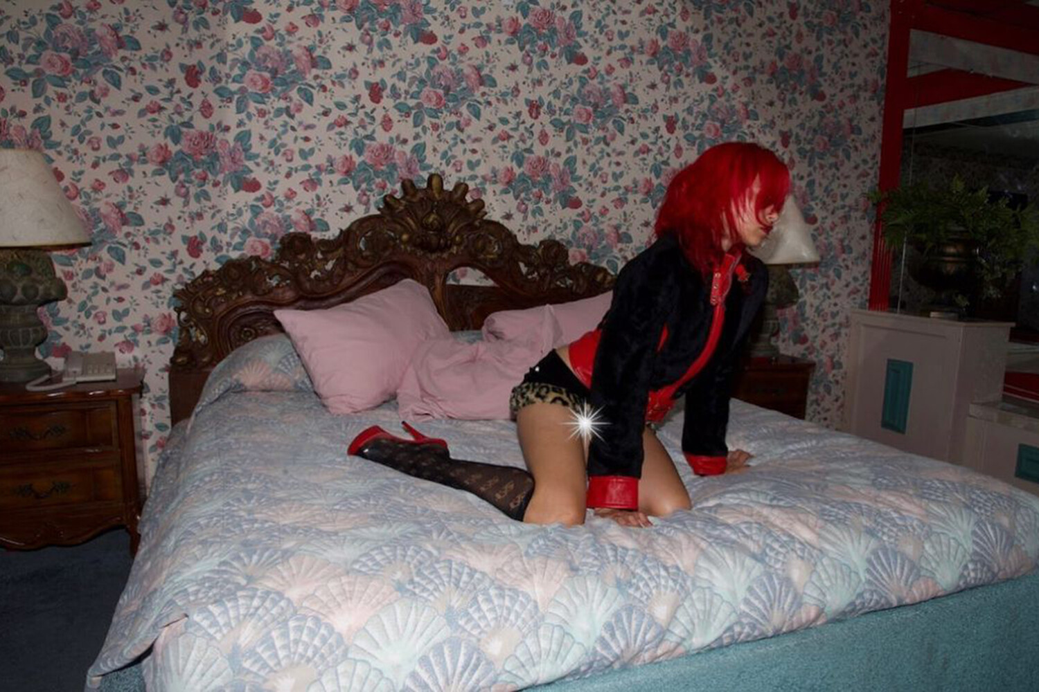 22-летняя Эрика Кикнадзе опубликовала фотографию, на которой она позирует на кровати, стоя на коленях. Дочь телеведущего Ивана Урганта одета в черную мини-юбку с леопардовой подкладкой, красную рубашку и черный жакет. Блогерша дополнила образ ажурными черными чулками и красными лодочками на высоком каблуке.
