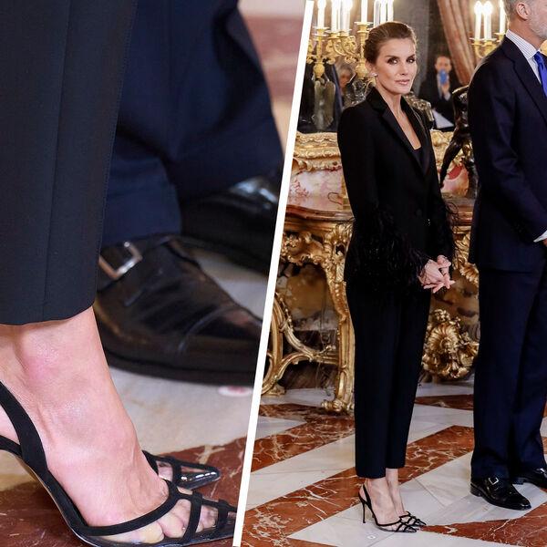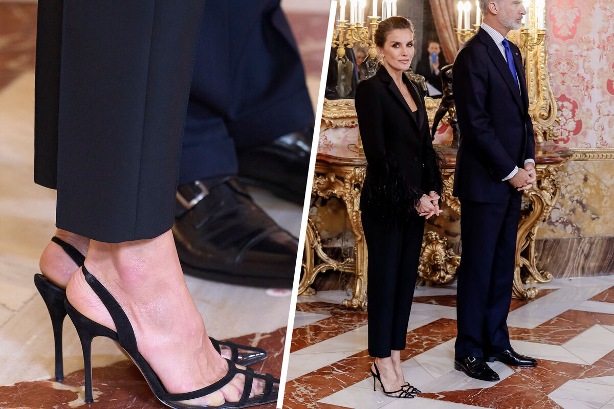 50-летняя королева выбрала для мероприятия эффектный черный костюм от испанского бренда Рertegaz, который состоял из укороченных классических брюк и пиджака с черными страусиными перьями на рукавах. Летиция дополнила образ прозрачными босоножками на высоком каблуке от Manolo Blahnik и бриллиантовыми серьгами в виде листьев от французского дома Chanel.