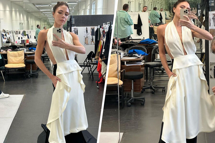 48-летняя бизнесвумен показала фигуру в белоснежном платье без бюстгальтера. Во время работы над собственной коллекцией одежды Виктория Бекхэм успела сделать пару кадров в будущих нарядах в окружении ассистентов.