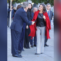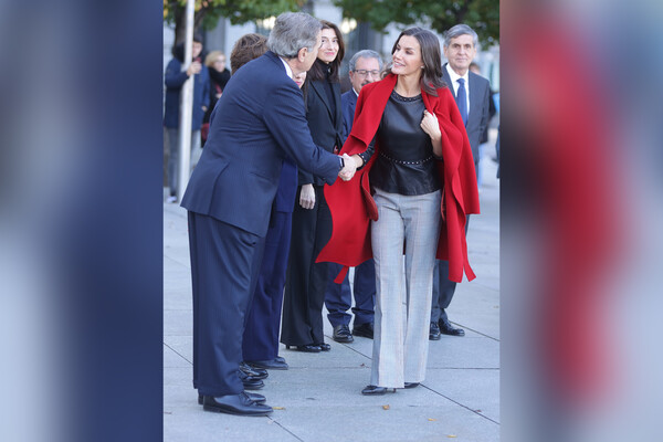 Королева Испании посетила мероприятие в столице, где женщины-юристы собрались для обсуждения своего вклада в профессию и гендерного равенства. Для этого случая Летиция надела малиновое пальто Hugo Boss в паре с клетчатыми черно-белыми брюками Mango и кожаным топом Uterque.