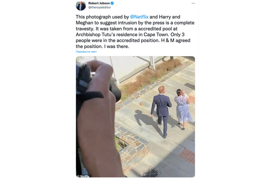 «Это фото, использованное Netflix, чтобы показать вторжение со стороны прессы, — совершенное искажение действительности. Оно было сделано членом пула аккредитованных журналистов в резиденции архиепископа Туту в Кейптауне. Только три человека были аккредитованы на эту позицию. Г и М одобрили эту позицию. Я там был», — написал Роберт Джобсон.