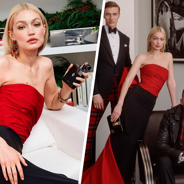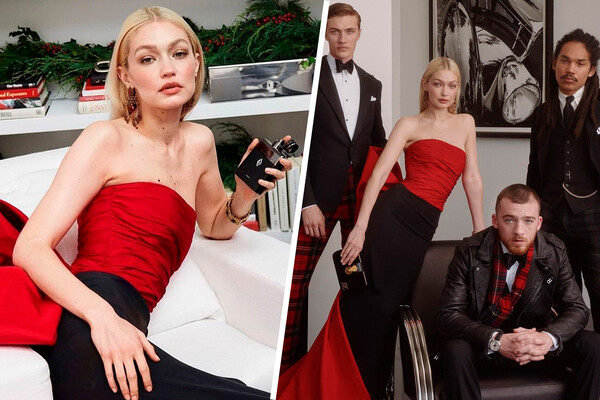 Для новогодней кампании Ralph Lauren Frangrances снялись сразу несколько звезд: Джиджи Хадид, Лаки Блю Смит, Ангус Клауд и Лука Саббат. Супермодель позировала в центре кадра. Она выбрала атласный топ-бюстье оттенка алой розы и черные брюки. Ей сделали лаконичную укладку и макияж с красными губами.