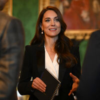 Для деловой встречи Кейт Миддлтон выбрала приталенный смокинг Alexander McQueen, брюки свободного кроя и блузу. Что касается аксессуаров, принцесса Уэльская остановилась на золотых серьгах с жемчугом.