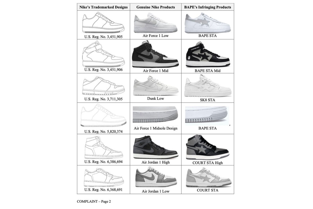 Обувной гигант Nike подал иск в федеральный суд против компании A Bathing Ape за нарушение прав на товарные знаки Nike Air Force 1, Air Jordan 1 и Nike Dunk. В иске утверждается, что «текущий обувной бизнес Bape вращается вокруг копирования культовых дизайнов Nike». В документе также приводятся примеры пяти самых продаваемых моделей обуви Bape — Bape STA, Bape STA Mid, SK8 STA, Court STA High и Court STA, которые, по мнению обвиняющей стороны, являются «почти дословными копиями» вышеупомянутых кроссовок Nike.