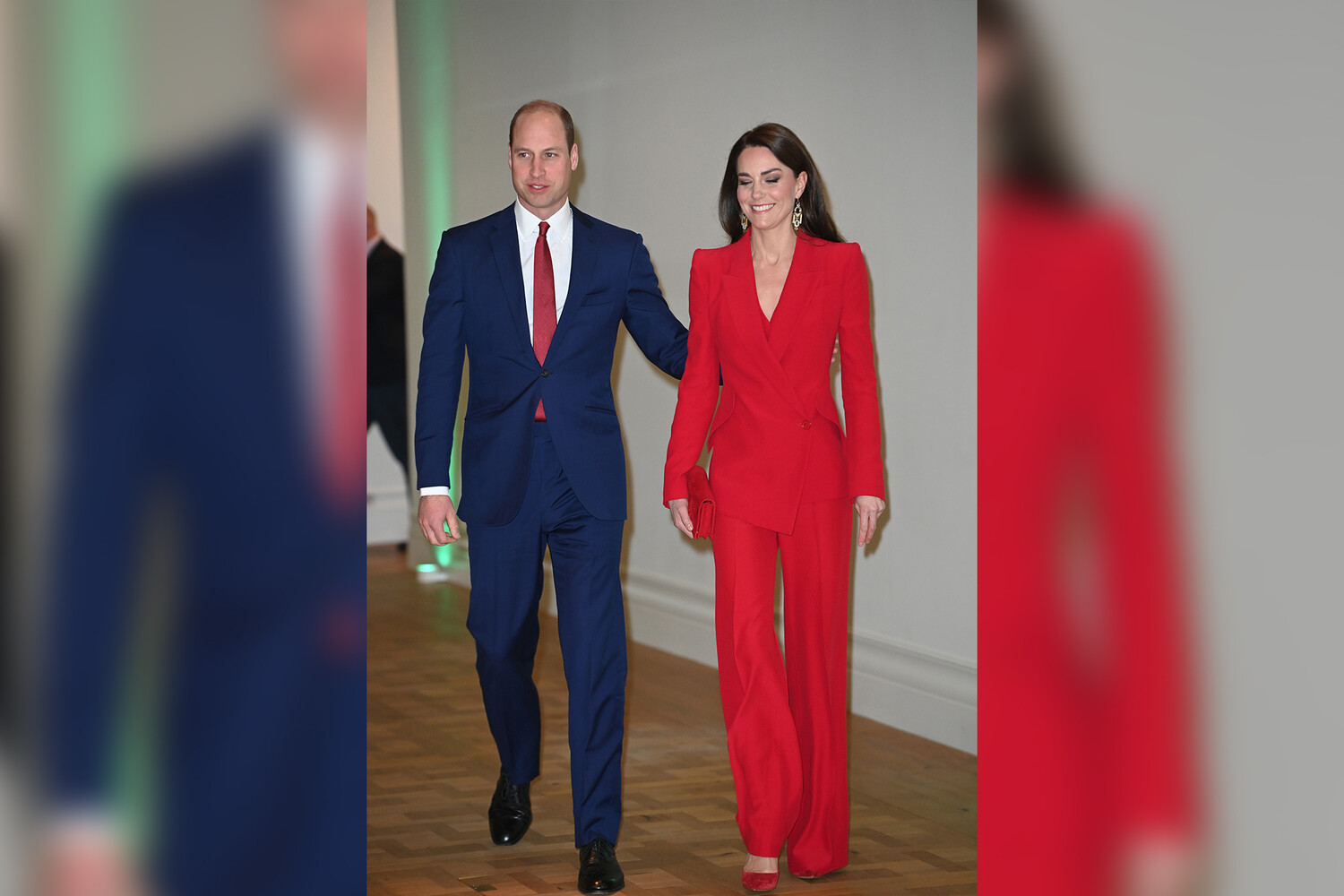 Принц Уильям, сопровождавший супругу, был одет в темно-синий костюм, белую рубашку и черные лаковые туфли. Его образ дополнил красный галстук, перекликавшийся по цвету с нарядом Кейт Миддлтон.