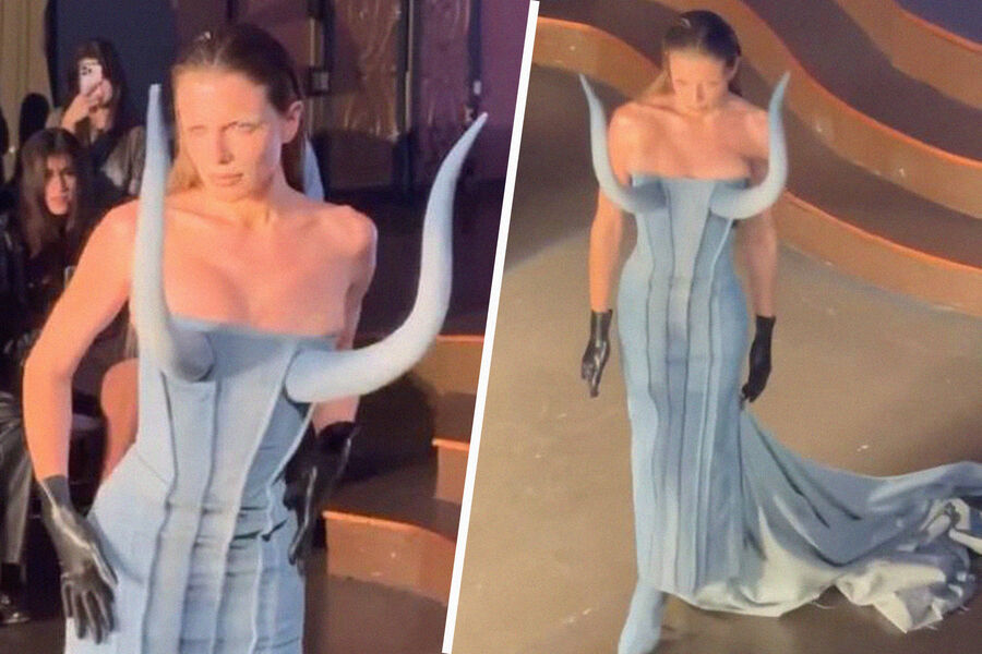 33-летняя актриса приняла участие в показе испанского дизайнера Luis de Javier в качестве модели, чтобы продемонстрировать, пожалуй, самый яркий наряд из новой коллекции бренда. Бывшая девушка Канье Уэста вышла на подиум в обтягивающем джинсовом макси-платье со шлейфом и акцентными рогами в области груди. Авангардный образ Джулии Фокс дополнили черные перчатки из латекса и джинсовые ботильоны с острыми мысами.