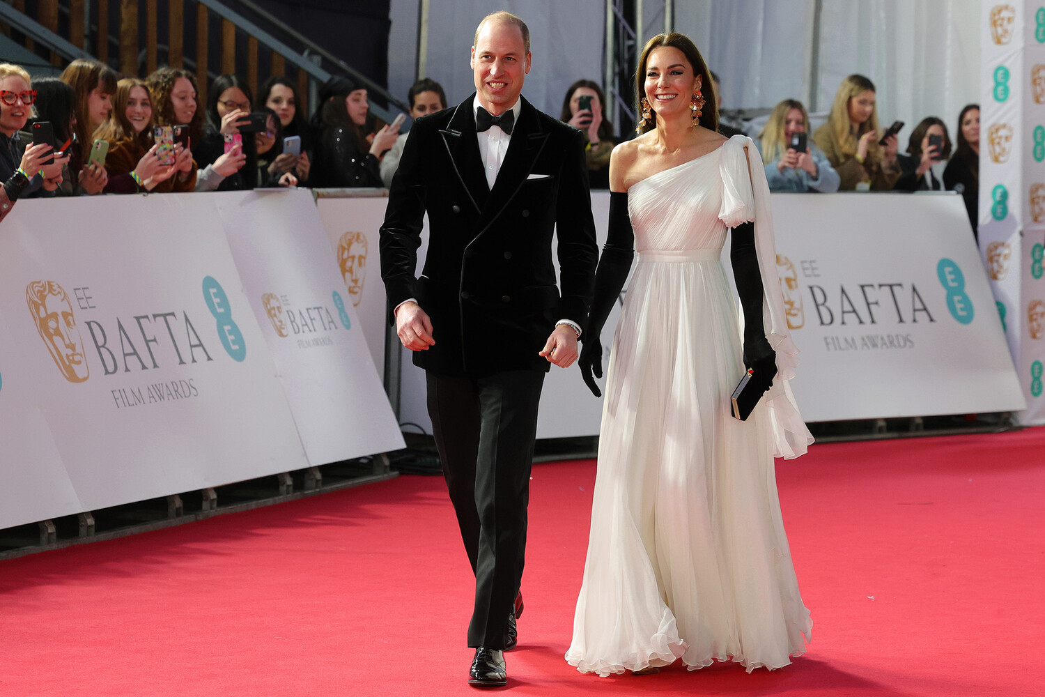 В минувшее воскресенье, 19 февраля, принц Уильям и Кейт Миддлтон посетили 76-ю церемонию вручения наград премии BAFTA в Королевском фестивальном зале в лондонском Саутбэнк Центре. Принцесса Уэльская появилась на публике в белом платье Alexander McQueen, которое носила еще в 2019 году, черных перчатках и серьгах Zara. Впрочем, привлечь к себе внимание ей удалось не только с помощью наряда — во время выхода на красную ковровую дорожку Кейт шлепнула своего супруга Уильяма по ягодицам.