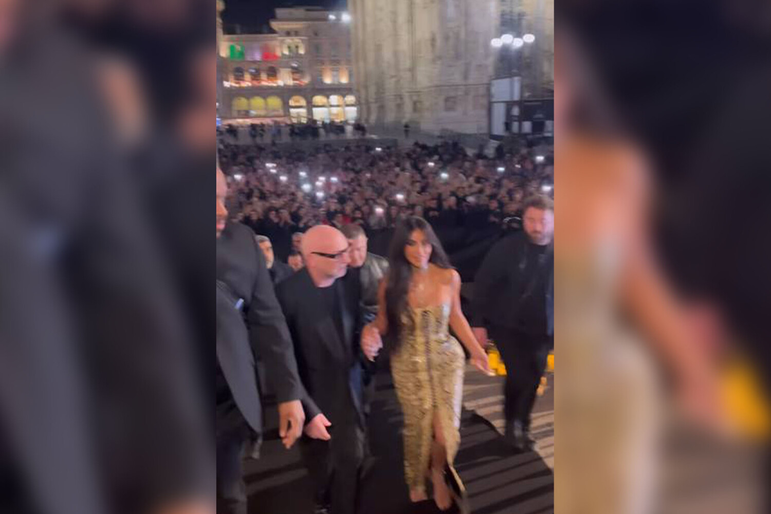 Ким Кардашьян приехала вечером на ужин Dolce & Gabbana в Палаццо Реале на площади Дуомо. Для выхода она выбрала архивное обтягивающие платье бренда со змеиным принтом из коллекции 2005 года. Дизайнеры Доменико Дольче и Стефано Габбана помогали звезде подняться по ступенькам в узком платье и приветствовали толпу, которая собралась на площади, чтобы посмотреть на Ким Кардашьян.