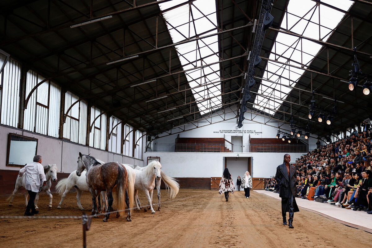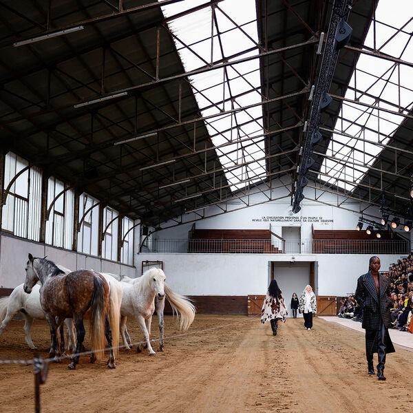 Показ состоялся в старейшей во Франции школе верховой езды Manège de l'École Militaire. Первыми на импровизированном подиуме появились скакуны.