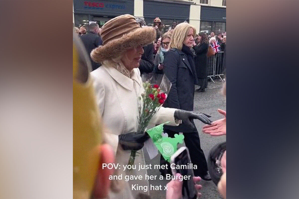 На этой неделе Карл III и Камилла посетили Колчестер в английском графстве Эссекс, который приобрел статус города во время празднования Платинового юбилея Елизаветы II в прошлом году. Во время приветствия собравшихся королева-консорт получила необычный подарок — британка Либерти Уильямс преподнесла ей бумажную корону из Burger King. «О, дорогая, это очень мило с твоей стороны», — произнесла растерянная Камилла, приняв презент, не примерив его.