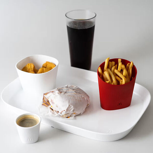 Чтобы соответствовать местным законам, французская сеть McDonald's будет подавать свои блюда в многоразовых контейнерах, сделанных в эстетике фирменной упаковки ресторана. Высокопрочные контейнеры и посуда сделаны из специальной пластиковой смолы, которая помогает сохранить вкус и запах пищи без ущерба для материала с течением времени. Теперь холодные напитки будут подаваться в прозрачных пластиковых стаканах, а картофель фри и наггетсы в красных контейнерах с ребристой поверхностью.