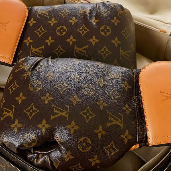 Пара боксерских перчаток с монограммой LV в классической коричнево-оранжевой кожаной расцветке выставлены на продажу вместе с тренировочным ковриком, на котором изображена серия шагов, пронумерованных от 1 до 12 и украшенных эмблемами дома моды, пыльником с монограммой инициалов K.L покойного Карла Лагерфельда и кожаным чехлом.