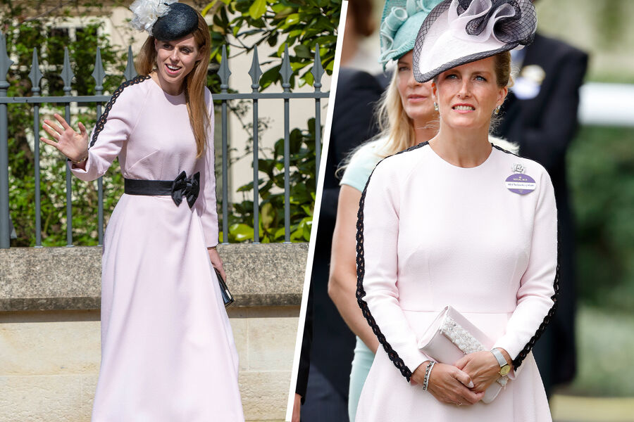 Герцогиня Эдинбургская, супруга принца Эдварда, вышла в точно таком же платье пять лет ранее. Она стилизовала его с бежевыми лодочками и розово-фиолетовой шляпой.