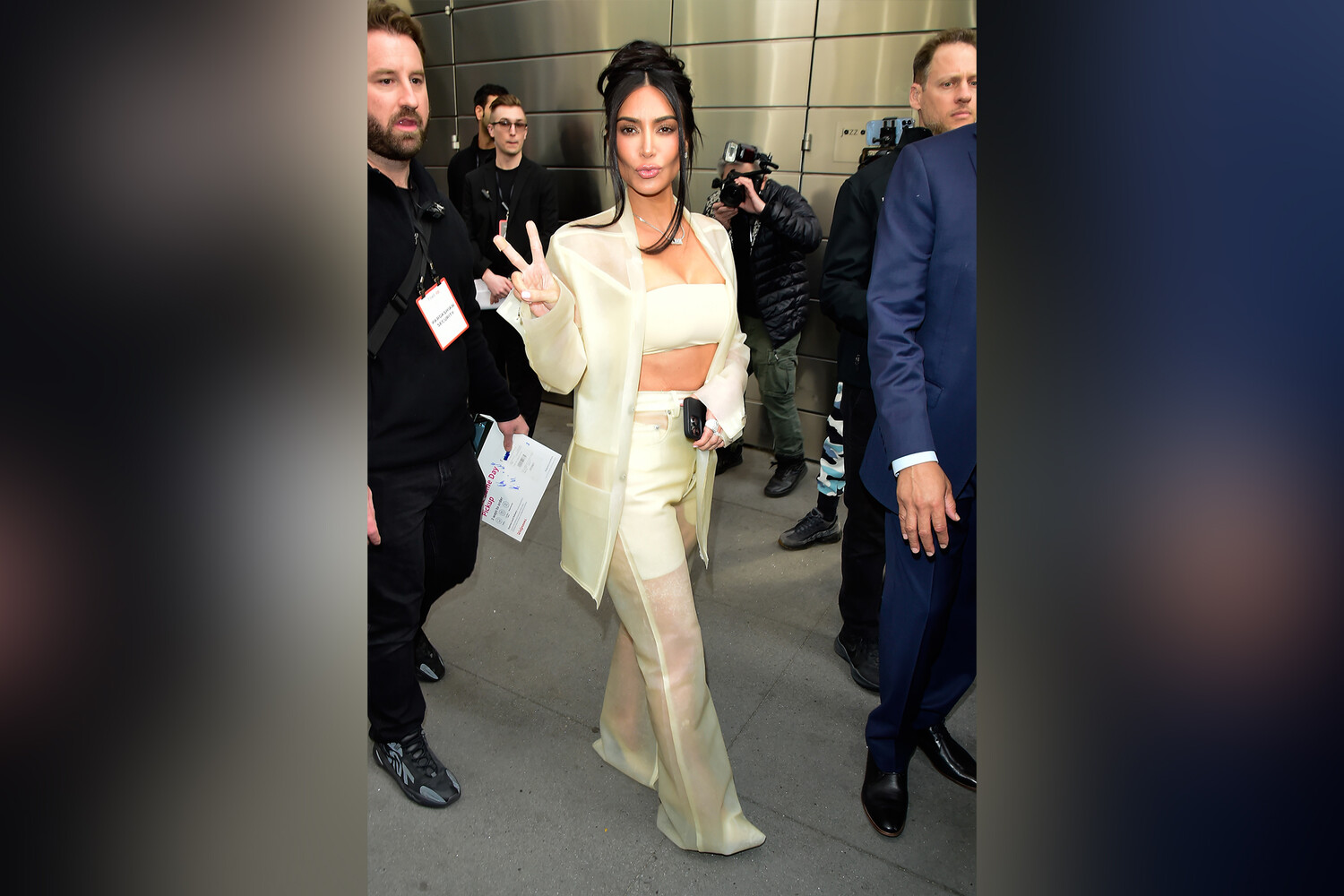 42-летняя звезда появилась на публике в прозрачном брючном костюме-двойке бренда Rick Owens общей стоимостью £6180 (630422 руб.). Под пиджак она надела телесный топ-бандо и дополнила образ остроносыми туфлями-лодочками на шпильке и цепочкой с подвеской в виде ее имени.