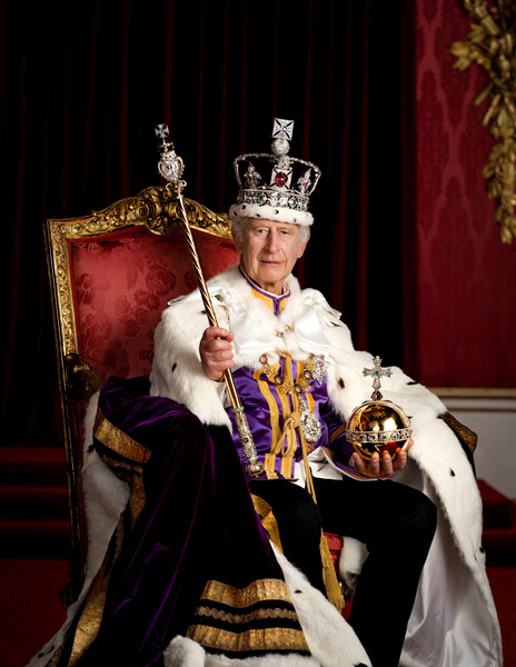 Новые портреты монархов были сделаны в Тронном зале Букингемского дворца британским фотографом Хьюго Бернардом, которые на протяжении долгих лет сотрудничает с королевской семьей. На снимке Карл III запечатлен в королевской мантии и государственной короне, с державой и скипетром в руках.