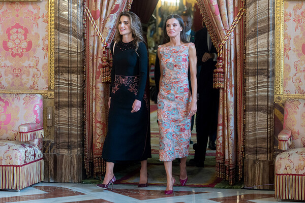 После встречи во дворце королевы посетили Институт культурного наследия Испании. Летиция была одета в миди-платье без рукавов Diego Estrada, сшитое из жаккардовой ткани с цветочным принтом, и кожаные туфли с открытой пяткой Carolina Herrera. На Рании было темно-синее миди-платье Dior с длинным рукавом и вышивкой в виде бабочек, а также замшевые лодочки Manolo Blahnik.