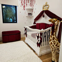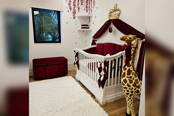 Комната новорожденной Адиры оформлена в светлых тонах. В детской есть собственная гардеробная, в которой уже лежит дизайнерская одежда и обувь. Над кроватью девочки установлена массивная золотая корона, под которой закреплена штора-балдахин из темно-красного бархата.