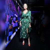 36-летняя Настасья Самбурская выбрала для выхода шелковое платье с рюшами в районе декольте и высоким разрезом от бедра. Актриса дополнила образ зеленой атласной сумкой в тон платью и красными босоножками на высоком каблуке. Звезда уложила волосы на манер голливудских волн и сделала макияж с акцентом на красную помаду.