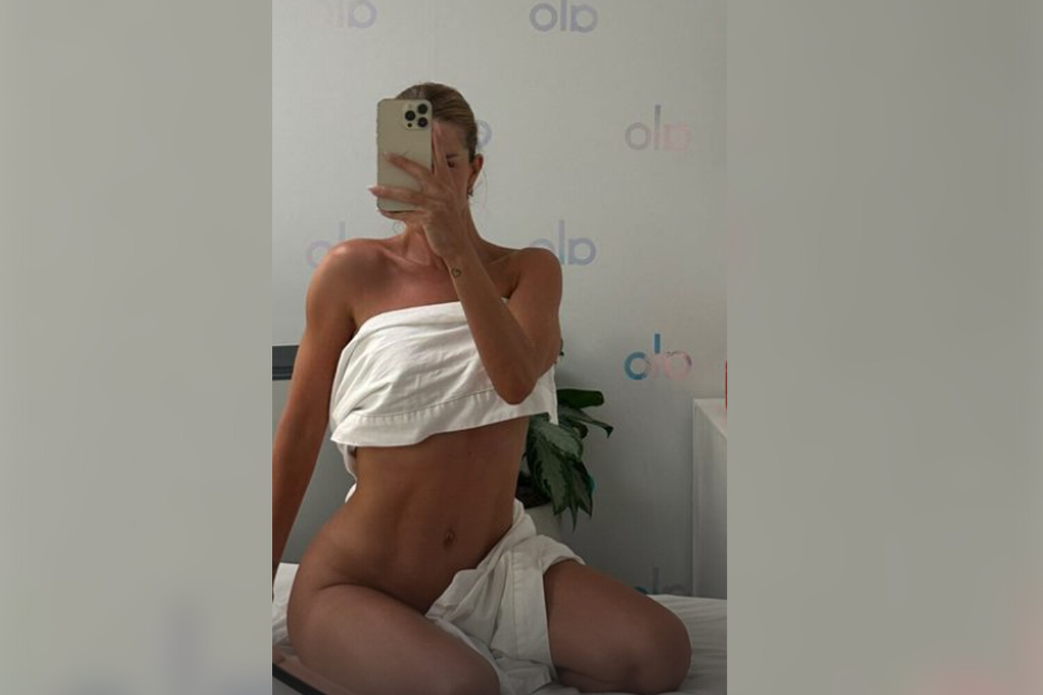 Рози Хантингтон-Уайтли опубликовала кадры, сделанные в спа-салоне. Перед камерой она позировала обнаженной, прикрывая грудь простыней.