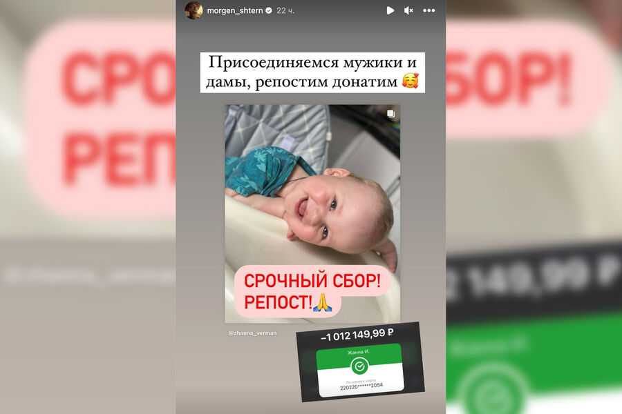 Рэп-исполнитель опубликовал скриншот из онлайн-банка, в котором была зафиксирована сумма 1 012 149,99 рублей. Моргенштерн пояснил, что он перевел деньги на лечение больного ребенка и призвал подписчиков присоединиться к сбору средств.