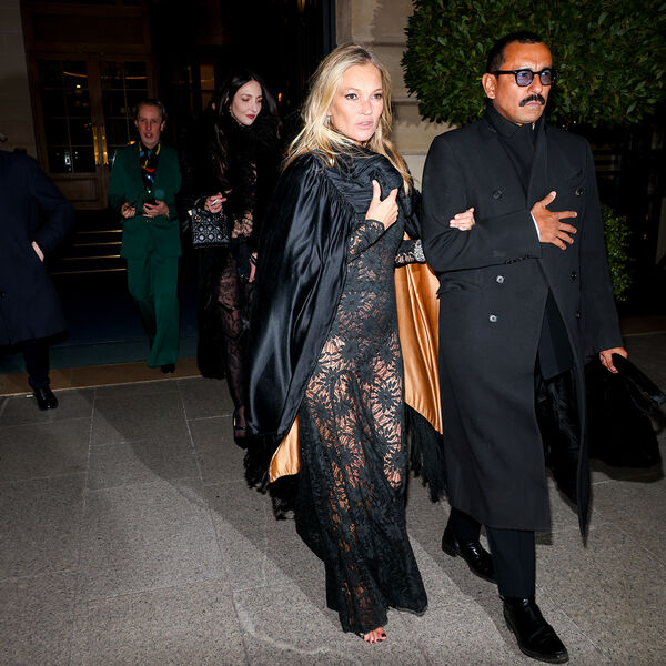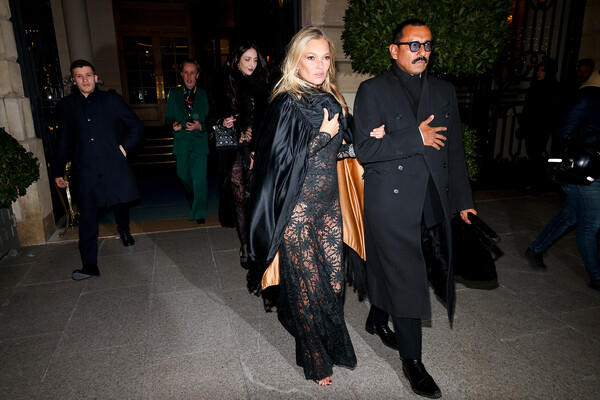 Папарацци засняли Кейт Мосс, когда она направлялась в заведение. Знаменитость была одета в черное платье-макси из прозрачного кружева, поверх которого накинула атласную накидку с перьями. Супермодель добавила к образу серьги с бриллиантами и сияющие босоножки. Она сделала небрежную укладку и макияж с акцентом на глаза.