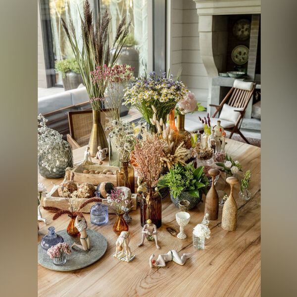В центре пространства стоит стол из дерева, окруженный стульями из того же материала. У стены установлен камин, а из панорамных окон открывается вид на сад. На столе стоят вазы с сухоцветами, маленькие фигуры из фарфора и свечи.