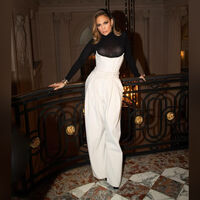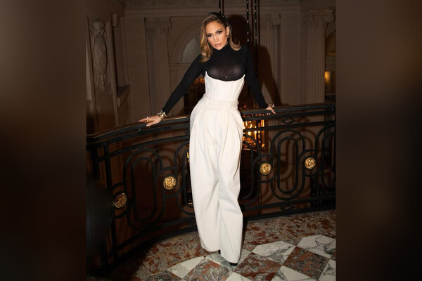 Перед камерой 54-летняя Дженнифер Лопес предстала в черной водолазке, поверх которой был надет корсет цвета слоновой кости без бретелей. Знаменитость дополнила наряд широкими брюками на завышенной талии, золотыми массивными серьгами, браслетами, кольцом и черным бантом на волосах. Актриса сделала макияж с черными стрелками и нюдовой помадой.