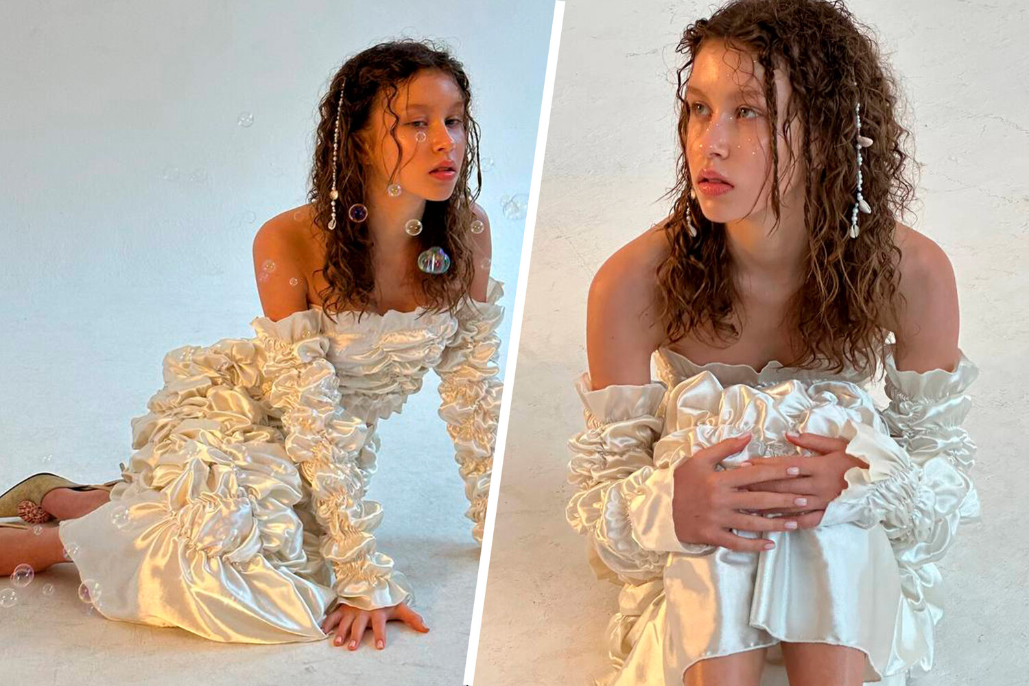 Перед камерой Анна Пересильд позировала в винтажном белом мини-платье с оборками и открытыми плечами. Ей также сделали укладку с мелкими локонами и макияж с блестками.