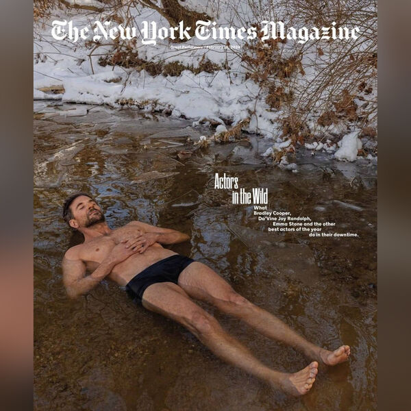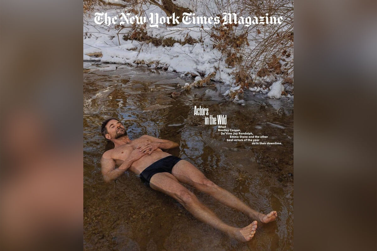 На одном из кадров 49-летний Брэдли Купер предстал полуобнаженным. Актер был запечатлен в одних трусах черного цвета. Артист лежал в воде с закрытыми глазами, положив руки на грудь. Знаменитость позировал на фоне снега и растаявшего льда. Фотографом съемки выступил Джеймс Нахтвей.