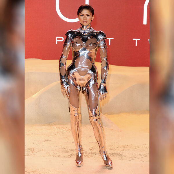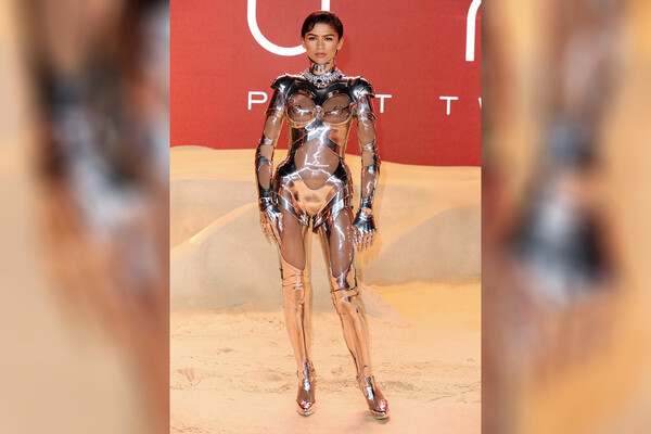 На ковровой дорожке Зендая позировала в «голом» костюме робота из коллекции бренда Mugler 1995 года. Волосы ей уложили в низкий пучок и сделали «мокрый» макияж.
