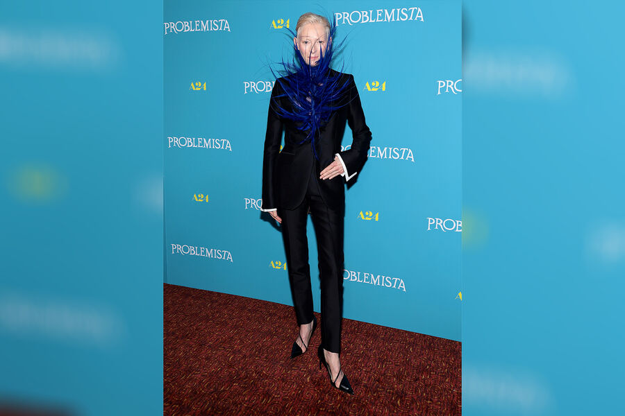 Во вторник, 27 февраля в кинотеатре Village East в Нью-Йорке прошла премьера фильма «Проблемиста». Для выхода на публику Тильда Суинтон предпочла строгий костюм Jean Paul Gaultier Haute Couture из весенней коллекции 2023 года. Жакет был дополнен синими перьями. Образ завершили лодочки на высоких каблуках.