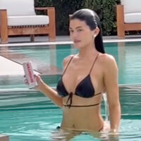 Перед камерой 26-летняя Кайли Дженнер предстала в черном крошечном бикини с завязками, которые подчеркнули ее фигуру. Она также надела маленькие серьги. Знаменитость распустила волосы и отказалась от макияжа. Модель купалась в бассейне и пила алкогольный низкокалорийный газированный напиток Sprinter.