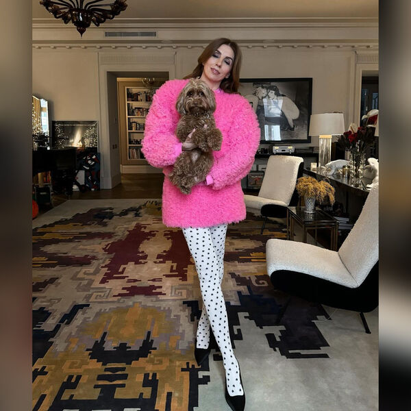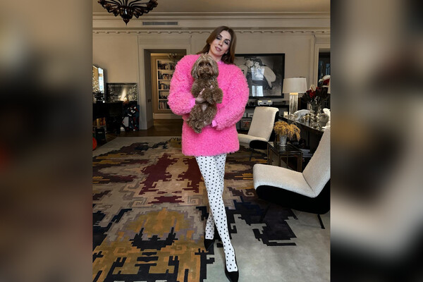 Перед камерой 55-летняя Светлана Бондарчук позировала в белых колготках в черную крапинку, которые дополнила укороченной розовой шубой. Образ дополнили черные туфли с острым мысом и кожаная сумка. Волосы она распустила и сделала легкий макияж. В руки она взяла своего домашнего питомца.