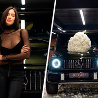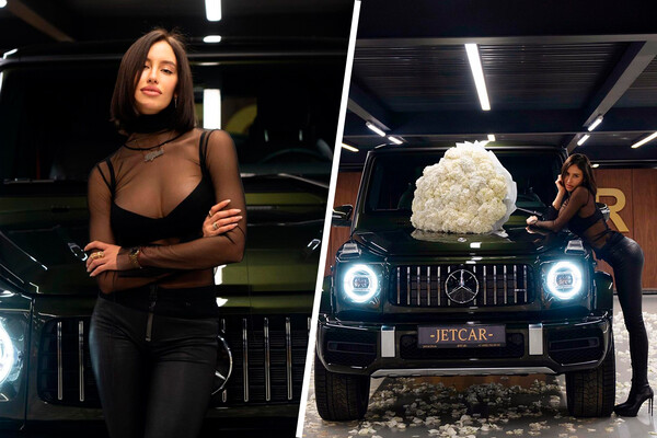 Тимати купил модели Валентине Ивановой новый автомобиль — Mercedes-Benz G-Класса темно-зеленого цвета. Модель снялась у машины в прозрачном топе и кожаных джинсах.