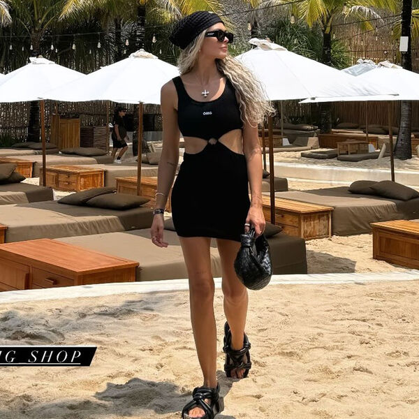 Мария Горбань позировала в черном мини-платье с разрезами, которое дополнила массивными украшениями, босоножками и сумкой из кожи. На волосы она завязала бандану.