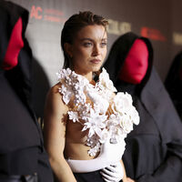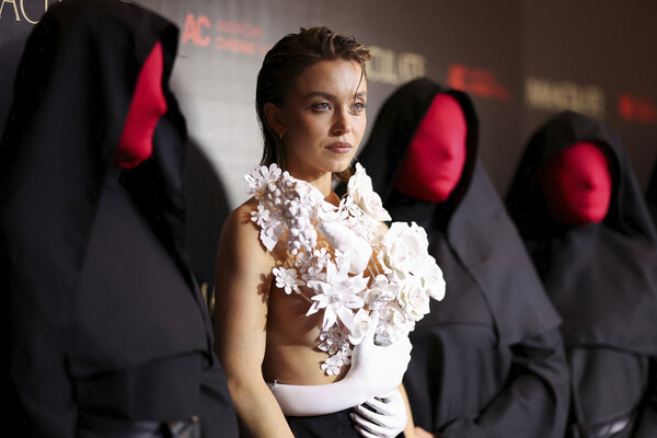 26-летняя Сидни Суини стала гостьей премьеры фильма «Омен. Непорочная», которая состоялась в Лос-Анджелесе. На светском мероприятии актриса появилась в образе французского бренда Balmain. Знаменитость надела белый топ, который напоминал руки, держащие букет. Она дополнила его черными брюками с завышенной талией и туфлями на каблуках. Наряд завершили маленькие серьги и кафф. Визажисты сделали Сидни Суини нюдовый макияж, а стилисты — укладку с эффектом мокрых волос.