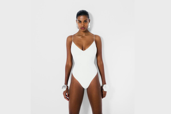Модель Тина Кунаки позировала в белом слитном купальнике, парных браслетах из металла и массивных серьгах. Волосы ей уложили в высокий пучок и сделали нюдовый макияж с блеском на губах.