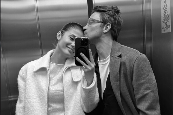В кадре Александр Петров предстал в белой футболке, черном пиджаке, брюках и сером пальто. Актер также надел очки для зрения. Виктория Антонова была запечатлена в блестящей блузе, куртке с воротником и широких брюках. Супруги позировали в лифте. Александр Петров целовал свою возлюбленную в лоб, а она улыбалась в камеру.