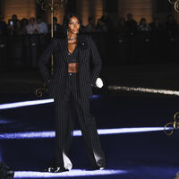 53-летняя Наоми Кэмпбелл вышла в свет в откровенном топе в горошек. Супермодель сочетала его с черным брючным костюмом в полоску. Звезда подиумов также надела массивные серьги, колье, брошь в виде цветка и туфли на каблуках. Наоми Кэмпбелл распустила волосы. Визажисты сделали ей макияж с черными тенями и розовыми губами.