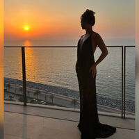 33-летняя Ида Галич предстала перед камерой в черном сияющем макси-платье с декольте, которое подчеркнуло ее фигуру. Блогерша дополнила наряд серьгой и бриллиантовым браслетом. Визажисты сделали телеведущей макияж с черными стрелками и темно-розовым блеском, а стилисты собрали волосы в высокую прическу с прядями у лица. Звезда позировала стоя на балконе в Дубае.
