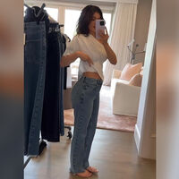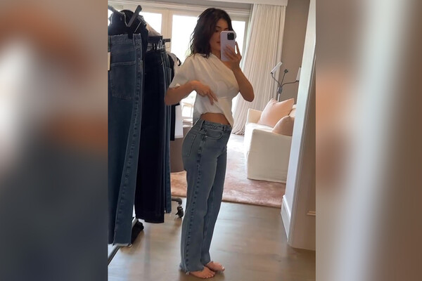 На новых кадрах 26-летняя Кайли Дженнер подняла белую футболку и показала свой плоский живот после того, как в прессе появились сплетни о ее беременности. Она также надела голубые джинсы с завышенной талией собственного бренда Khy. Модель позировала с распущенными волосами и нюдовым макияжем.