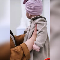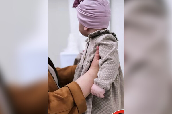 На снимке девочка была запечатлена в сером платье на пуговицах, которое было украшено воротником. Матильде также одели сиреневый тюрбан. Дочь Евгения Петросяна и Татьяны Брухуновой держали на руках. Она отвернула голову от камеры.