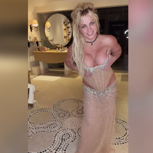 42-летняя Бритни Спирс предстала в кадре в бежевом прозрачном костюме, который был украшен стразами. Комплект состоял из корсета и макси-юбки. Певица также надела чокер. Знаменитость сделала макияж с угольно-черными стрелками и нюдовой помадой и укладку. Она танцевала перед камерой.