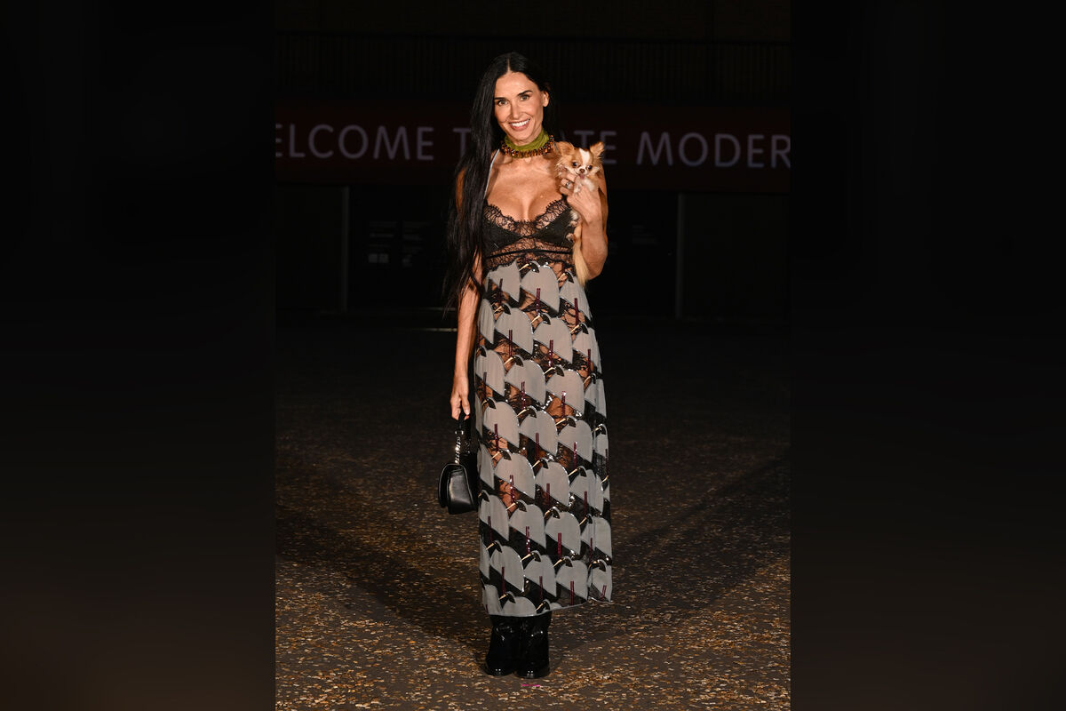 61-летняя Деми Мур посетила показ круизной коллекции Gucci, над которой работал креативный директор бренда Сабато де Сарно. Шоу прошло в галерее Тейт в Лондоне. На светском мероприятии актриса появилась в макси-платье из прозрачного кружева, подчеркнувшем ее фигуру. Знаменитость дополнила наряд золотой цепью, черной сумкой и лакированными сапогами. Перед фотографами Деми Мур позировала со своей собакой Пилаф.