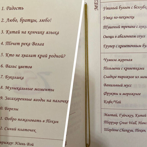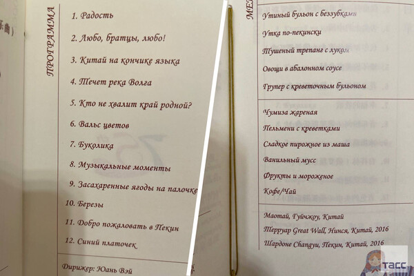 По информации журналистов, в меню вошли утка по-пекински, утиный бульон с беззубиками, тушенный трепанг с луком, групер с креветочным бульоном, овощи в абалонном соусе, чумиза жареная, пельмени с креветками, сладкое пирожное из маша, ванильный мусс. Гостям предложили безалкогольные и алкогольные напитки, среди которых есть китайские вина и водка Маотай. Оркестр исполнял русские и китайские песни.